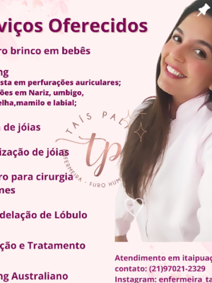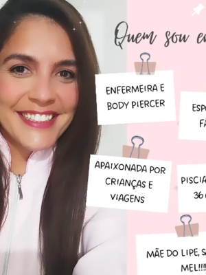 ou a Taís Palma, Enfermeira Especialista em Perfuração Humanizada e Body Piercing. Ajudo famílias que desejam um momento leve, seguro e sem traumas na hora de colocar o primeiro brinquinho em seus filhos. Realizo perfurações em recém-nascidos, bebês e crianças, com muito carinho, atenção e, principalmente, técnica.